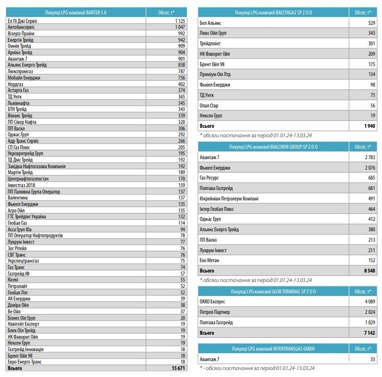 Своєю чергою, з початку 2024 року компанія Barter відвантажила українським імпортерам до 15,7 тис. т загальною вартістю $9,6 млн, Bialchem Group – 8,5 тис. т на $5,3 млн, Baltykgaz – 1,9 тис. т на $1,15 млн, Glob Terminal – 7,1 тис. т на $5,8 млн.