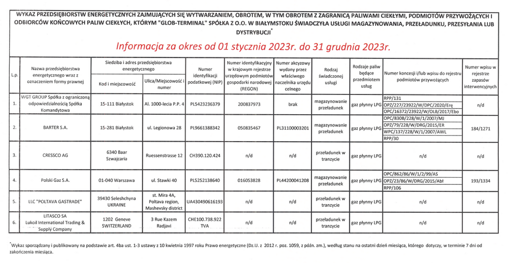 Glob Terminal: До 64 тис. т скрапленого газу з Польщі були експортовані у 2023 році до України за участю Glob Terminal. Компанія має власний термінал у Бранєво, але як вже зазначалося є користувачем послуг перевалки майже на всіх ключових перевалках Польщі, що дає можливість виступати експортером-відвантажувачем газу від свого імені з будь якого польського LPG-хабу. Імпортери повідомляють, що купують у трейдера газ виробництва країн ЄС, США, Норвегії, Швеції, Великобританії, який постачається у порти Балтійського моря. Проте, оскільки газ продається імпортерам залізничним партіями на кордоні України, дати однозначну оцінку, чи не замішується цей газ з російським на терміналі компанії у Бранєво – не можна. До переліку користувачів послуг Glob Terminal входять такі польські компанії WGT Group, Barter, Polski Gaz. Серед нерезидентів - українська «Полтава Газтрейд», швейцарські Cressco та «дочка» «Лукойлу» Litasco SA Lukoil International Trading & Supply Company.