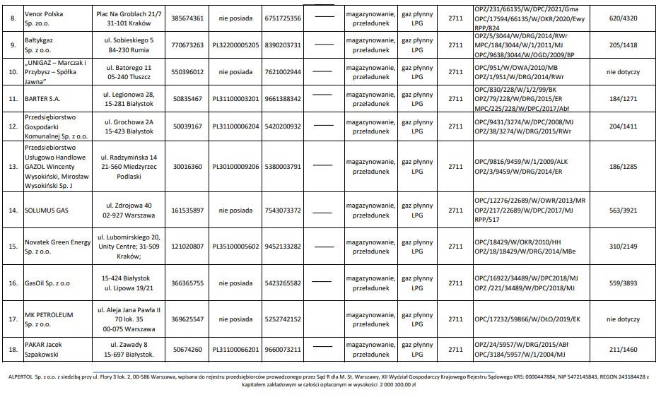 Aleksandra: Послугами терміналу Aleksandra групи компаній Trasa безпосередньо на залізничній станції Малашевичі у 2023 р. користувався ряд польських та іноземних компаній. У переліку, польські Anwim, Petrax trade, Tyczka polska, PUH Gazol, Venor polska, Pakar Jacek Szpakowski (далі – Pakar), Unimot, Solumus gas, Mar-rom і австрійська Evicor та румунський Vixon gas. Якщо враховувати постачання з інших базисів у Польщі, останні два нерезиденти, разом є продавцями до 10% імпорту скрапленого газу до України у 2023 році.