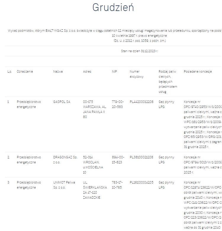Baltykgaz: Станом на грудень 2023 р. згідно публікації компанії останні 12 місяців послугами терміналу користувалися польські Gaspol, Dragongaz, та Unimot. В документах за перше півріччя серед клієнтів перевалки також Pakar та Glob Terminal. У списку користувачів послуг терміналу чомусь немає найбільшого продавця газу українським імпортерам – кіпрської WBS Resources (CY) LTD.