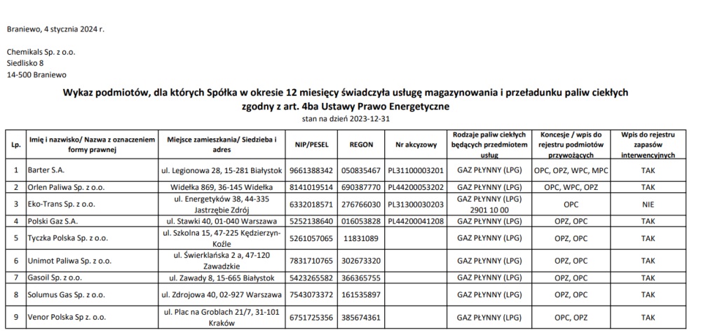 Chemikals: У опублікованому компанією переліку клієнтів за 2023 р. є Barter, Orlen Paliwa, Eko-Trans, Polski Gaz, Tyczka Polska, Unimot, Gasoil, Solumus Gas, Venor Polska. Вказаний перелік трейдерів стосується одразу двох об’єктів компанії. Chemikals також має термінал у с. Скандава, розташований поблизу переходу Железнодорожний (росія) – Скандава (Польща), куди протягом 2023 р. російські заводи відвантажили 40 тис. т газу. Додамо, постачання в Україну у 2023 р. з об’єктів Chemikals не здійснювалося.