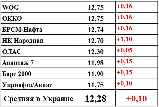 Например, в сетях АЗС WOG и ОККО цена выросла на 16 коп./л до 12,75 грн/л, аналогичное подорожание произошло на столичных АЗС «БРСМ-Нафта» до 12,74 грн/л.