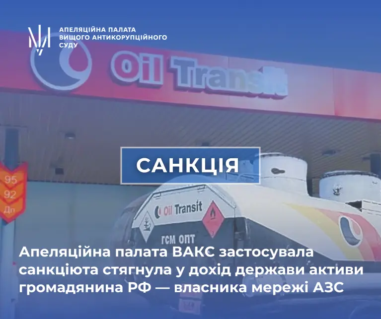 Апеляційна палата Вищого антикорупційного суду (ВАКС) 26 травня ухвалила рішення про застосування санкцій до громадянина Російської Федерації, який володів мережею автозаправних станцій на тимчасово окупованій території України. Про це повідомила пресслужба Апеляційної палати ВАКС.
