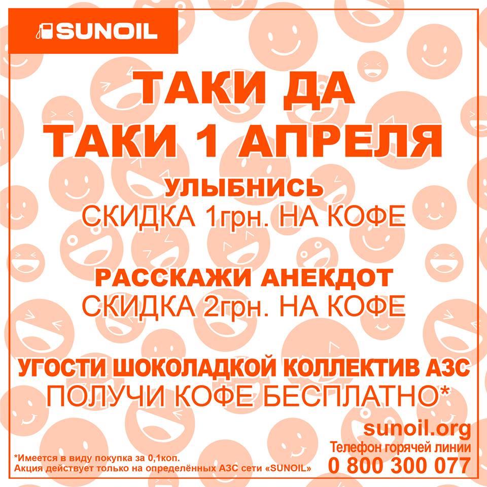 Сеть АЗС SUNOIL проводит акции на 1 Апреля.В частности, клиенты могут получить скидку на кофе улыбнувшись. Об этом сообщили в компании.