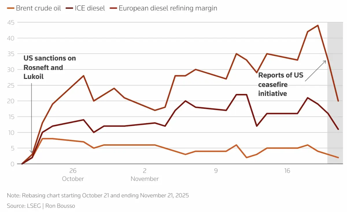 Хоча ціни на дизель в Європі пішли вниз після новин про обговорення припинення вогню у війні між Росією і Україною, вартість пального залишаються приблизно на 8% вищою за рівень 22 жовтня, коли США оголосили санкції проти двох найбільших російських нафтових компаній — «Лукойл» і «Роснефть».