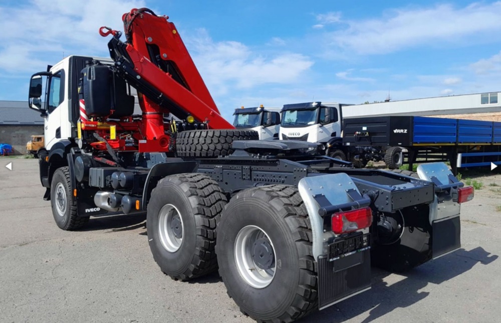 На сідельні тягачі IVECO T-WAY AD720T48WT H 6х6 позаду кабіни встановлено італійські шарнірні крани-маніпулятори для оперативного та зручного виконання завантаження та розвантаження кузова, який на мінімальному вильоті може підняти вантажі вагою до 8,7 т, а на максимальному вильоті стріли 10 м — до 2,2 т, розповіли в компанії «Техкомплект».