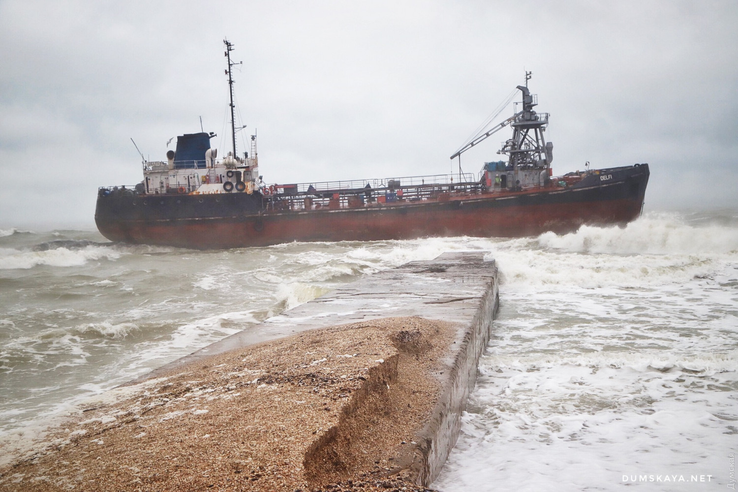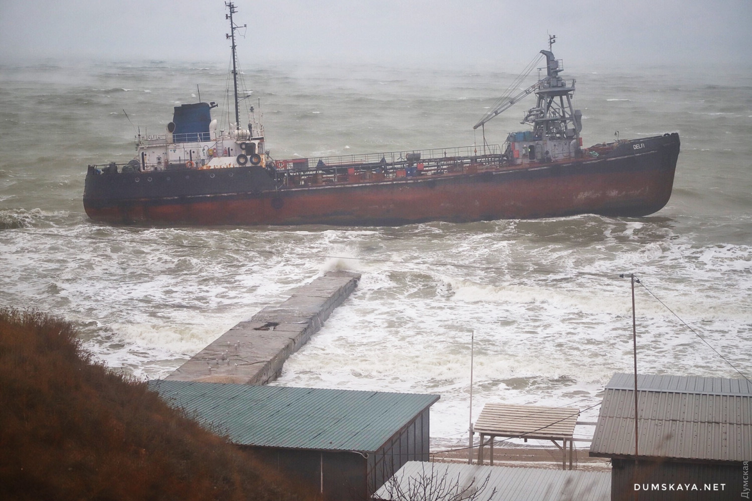 Терпящий бедствие танкер Делфи ночью сел на мель примерно в километре от пляжа Дельфин в Одессе. Утром 22 ноября шторм начал постепенно относит танкер к берегу, судно уже ударилось о волнорез, сообщает Думская.
