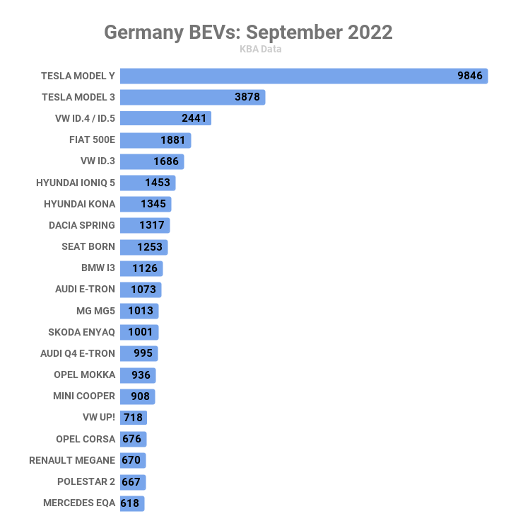 Хітом продажів у вересні стала Tesla Model Y. З огляду на те, що виробництво Tesla на заводі в Грюнхайде зараз набирає обертів і нещодавно перевалило за 2 тис. од. на тиждень, у вересні в Німеччині було зареєстровано рекордні 9846 од. Model Y. Це найбільший показник усіх серед усіх легковиків, включаючи бензинові та дизельні моделі. Model Y навіть обійшла популярний VW Golf з 7095 реєстрацій. Model 3 зайняла друге місце в рейтингу найкращих електрокарів вересня, а Volkswagen ID.4 та ID.5 – третє.