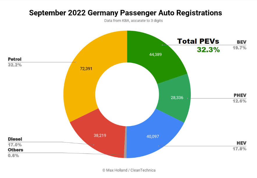 Минулого місяця найбільше зросли продажі чистих акумуляторних електрокарів (BEV) - на 31,9% порівняно з аналогічним періодом минулого року, до 44,4 тис. од. У вересні частка BEV становила майже 20% загальної кількості реєстрацій авто в Німеччині.