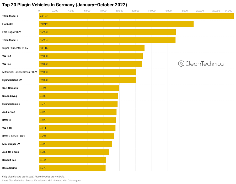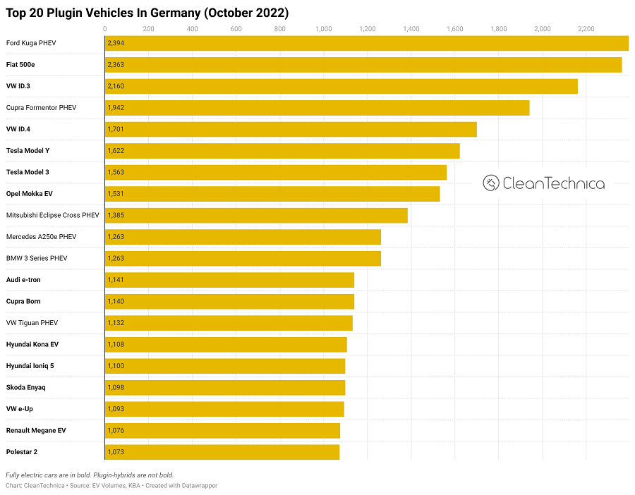 Попит на гібриди, що заряджаються від мережі (PHEV), також підвищився. У жовтні продажі таких авто в Німеччині збільшилися на 35%, що є найвищим темпом зростання з серпня 2021 року. У листопаді-грудні аналітики очікують також високих продажів PHEV, оскільки з наступного року Німеччина зупиняє надавати субсидії на покупку електромобілів такого типу. У жовтні було зареєстровано 32,06 тис. PHEV, що становило 15% від загальної кількості продажів авто.