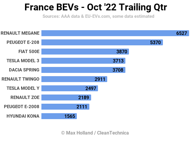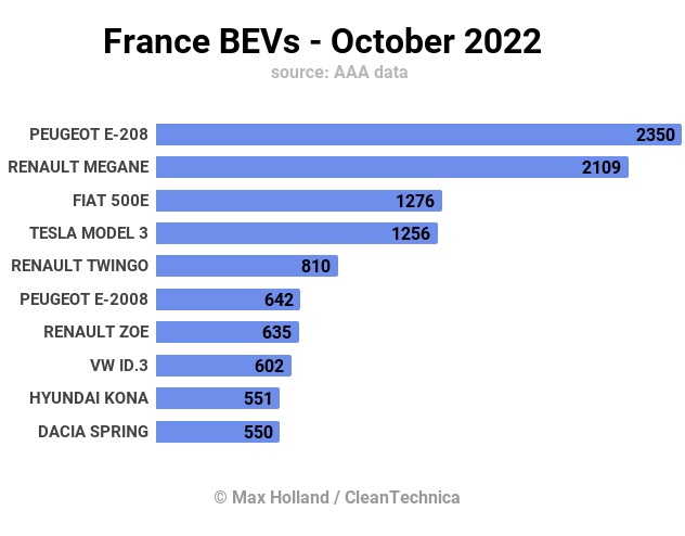 Найбільш продаваним чистим електромобілем жовтня став Peugeot e-208, який потіснив на друге місце Renault Megane - модель, яка є найпопулярнішим електрокаром у Франції за підсумками 10 місяців року. Компактний Fiat 500e зберігає третю позицію і за підсумками жовтня, і за підсумками 10 місяців, незначно обійшовши Tesla Model 3, що в обох рейтингах скотилася на 4 місце.