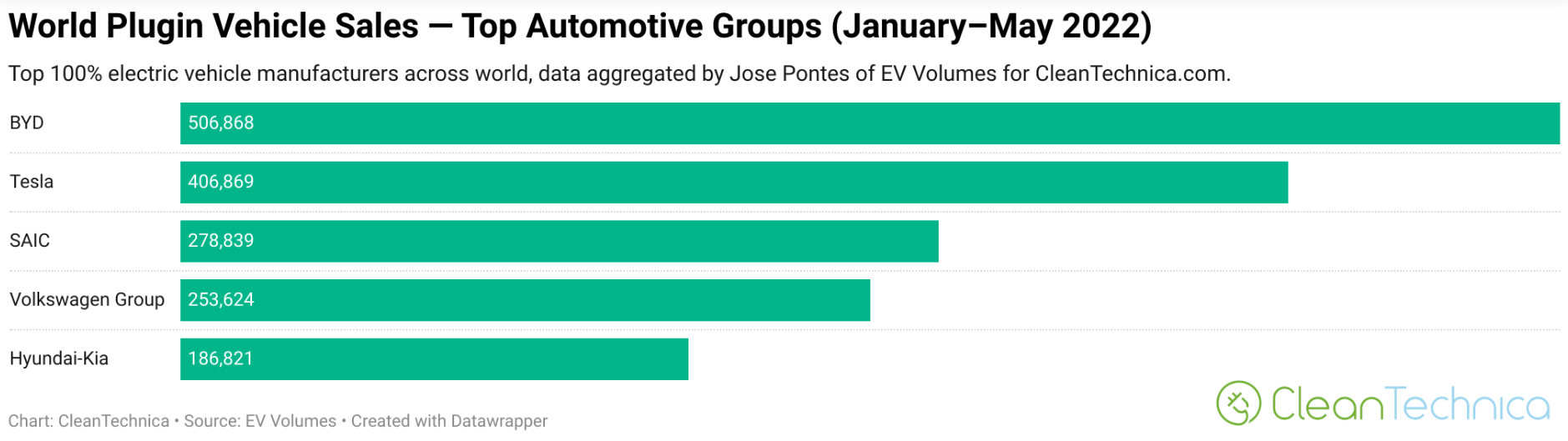 На першому місці серед виробників електрокарів - китайська компанія BYD, яка за п’ять місяців 2022 року продала 506,9 тис. авто на електротязі. До топ-20 популярних електромобілів травня входить одразу п’ять моделей цієї марки.