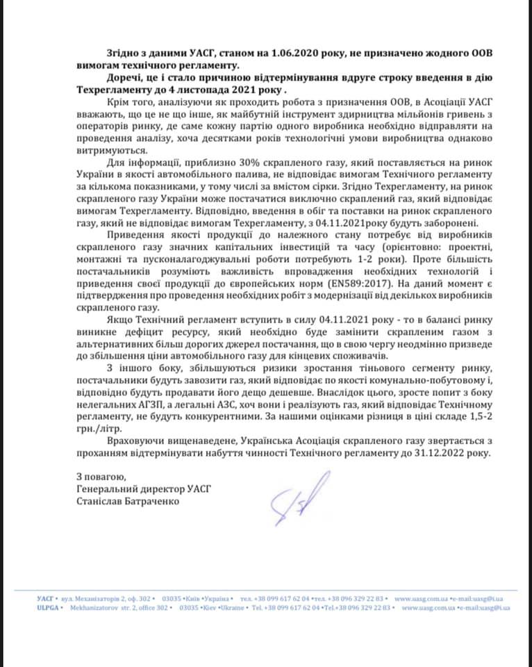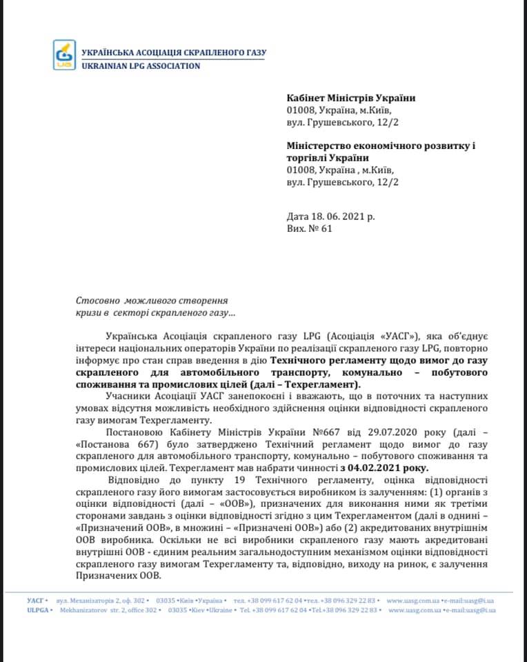 В Украинской ассоциации сжиженного газа LPG (УАСГ) считают, что из-за отсутствия назначенных органов оценки соответствия требованиям технического регламента СУГ (ТР), необходимо отсрочить вступление в силу требований ТР до 31 декабря 2022 года.