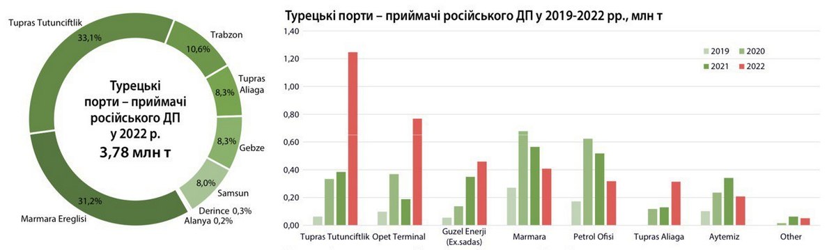 Найбільшим за обсягами перевалки танкерів з дизельним пальним з росії є термінал Tupras в м. Ізміт. В 2022 році відвантаження ДП з російських портів на цей базис зросло більше ніж втричі – з 0,38 до 1,25 млн т. Майже 78% продукту надійшли сюди з російських портів. Найбільшим постачальником російського продукту до терміналу Tupras став трейдер Coral Energy, який поставив 27% ДП у 2022 році - 225 тис. т газойлю та 116 тис. т ULSD за цим базисом. Ще 0,31 млн т відвантажено на терміналі Tupras в м. Аліага.