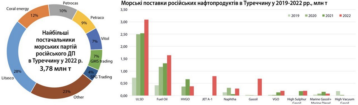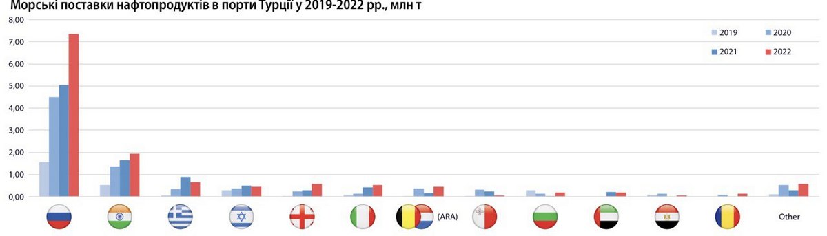 В 2022 році турецькі морські порти збільшили перевалку російських нафтопродуктів на 2,32 млн т, до 7,35 млн т (+46%), йдеться у дослідженні НафтоРинок. що опубліковано у Daily fuels&LPG від 8 березня 2023 р. Згідно аналізу данних морського руху пального до Туреччини, з російських портів найбільше за обсягами збільшилося постачання дистилятів: низько сірчисте дизпальне (ULSD) – на 0,56 тис. т до 3,09 млн т (+22%), дизпальне (Gasoil) – на 0,69 млн т (в порівнянні з однією поставкою в 4-30 тис. т на рік в 2019-2021 рр.).