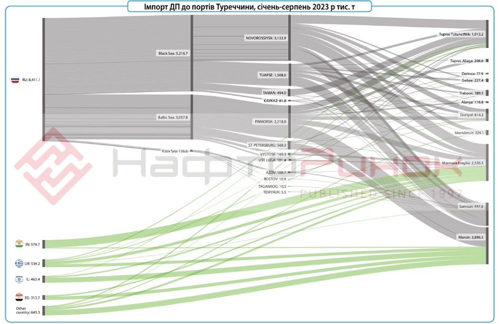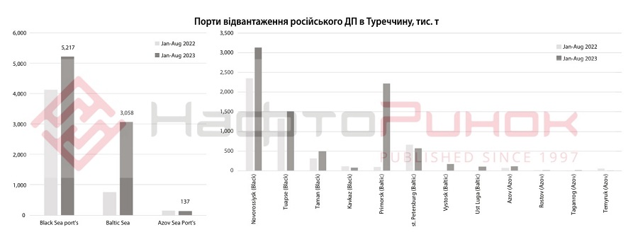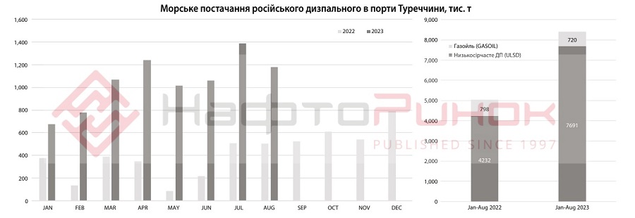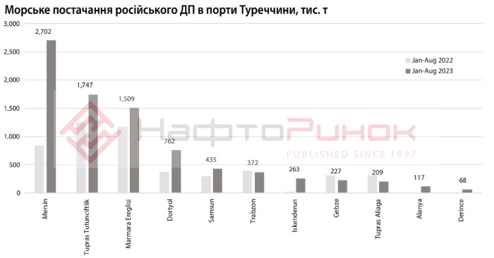 Таким чином, частка РФ в морських поставках ДП до Туреччини з початку року зросла до 76,9%, в порівнянні 36% за аналогічний період 2022 р. В 2023 році дизпальне з росії витіснило постачання до Туреччини пального з Італії – обсяги надходжень з цієї країни впали до 33 тис. т в порівнянні з 737 тис. т за січень-серпень 2022 р. Також позиції на турецькому ринку втратили: Індія (зменшила постачання до 0,57 млн т порівняно з 1,64 млн т в січні-серпні 2022 р.) та Ізраїль (0,46 млн т порівняно з 0,81 млн т), та Італія – два танкери сумарним обсягом 66 тис. т, порівняно з 901 тис. т за вісім місяців 2022 року).