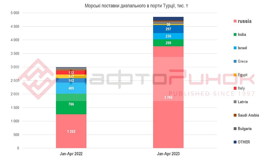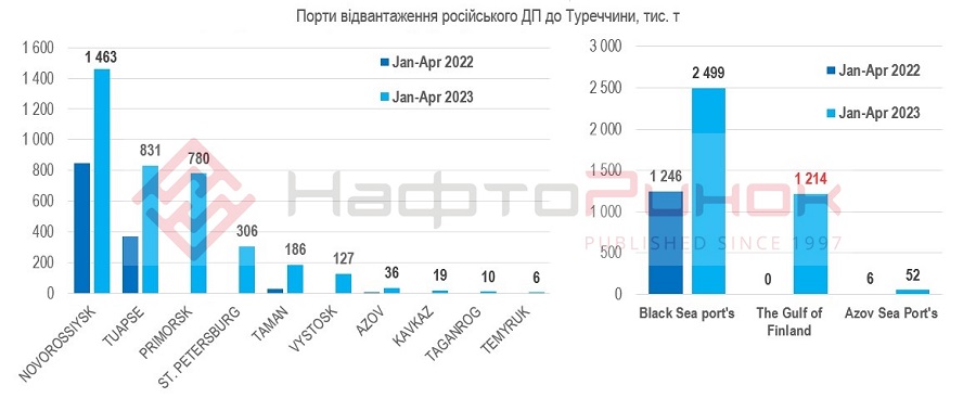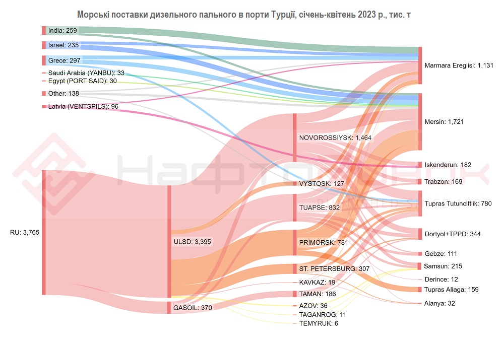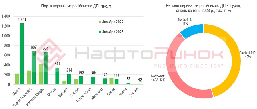 Таким чином, якщо протягом січня-квітня 2022 р. поставок взагалі не було, то в січні-квітні 2023 року, оминаючи всю Європу, з російських портів Фінської затоки до Туреччини надійшло 1,2 млн т російського низько сірчистого ДП (ULSD). До 70% обсягу з Фінської затоки були адресовані в порти на Півдні Туреччини. Проте 210 тис. т цього ресурсу було відвантажено на терміналах Мармари (в тому числі термінал OPET), та ще 181 тис. т на термінал НПЗ Tupras (Izmit) в м. Дерінже. Важливо, що дизпальне з цих перевалок також купують українські імпортери.