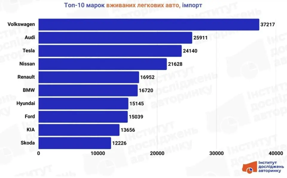 Рейтинг імпорту очолює незмінний лідер — Volkswagen, який пропонує найширший вибір: від бюджетних авто до преміальних кросоверів. На другій сходинці — Audi, а на третє вийшов американський виробник електромобілів Tesla. Суто електричний бренд обійшов багатьох традиційних конкурентів, ставши символом «зеленого» ажіотажу 2025 року. П’ятірку замикають Nissan та Renault.