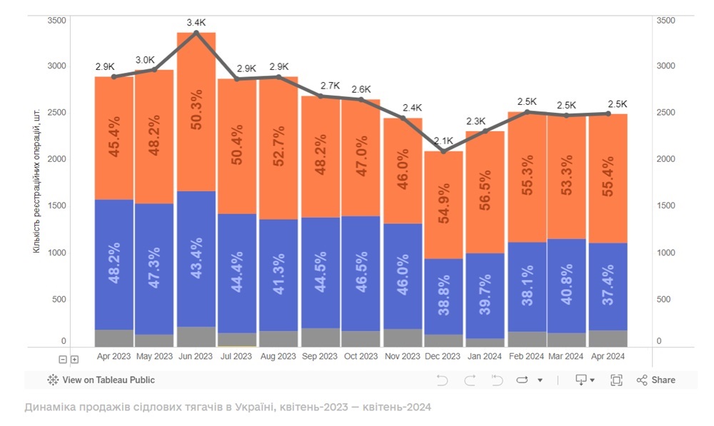 У квітні 2024 року українці сумарно придбали 2,5 тисячі нових та вживаних сідлових тягачів, на 22 од. більше, ніж місяцем раніше. Про це повідомляє Інститут досліджень авторинку (ІДА) з посиланням на власний аналіз даних МВС.