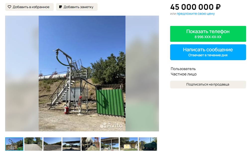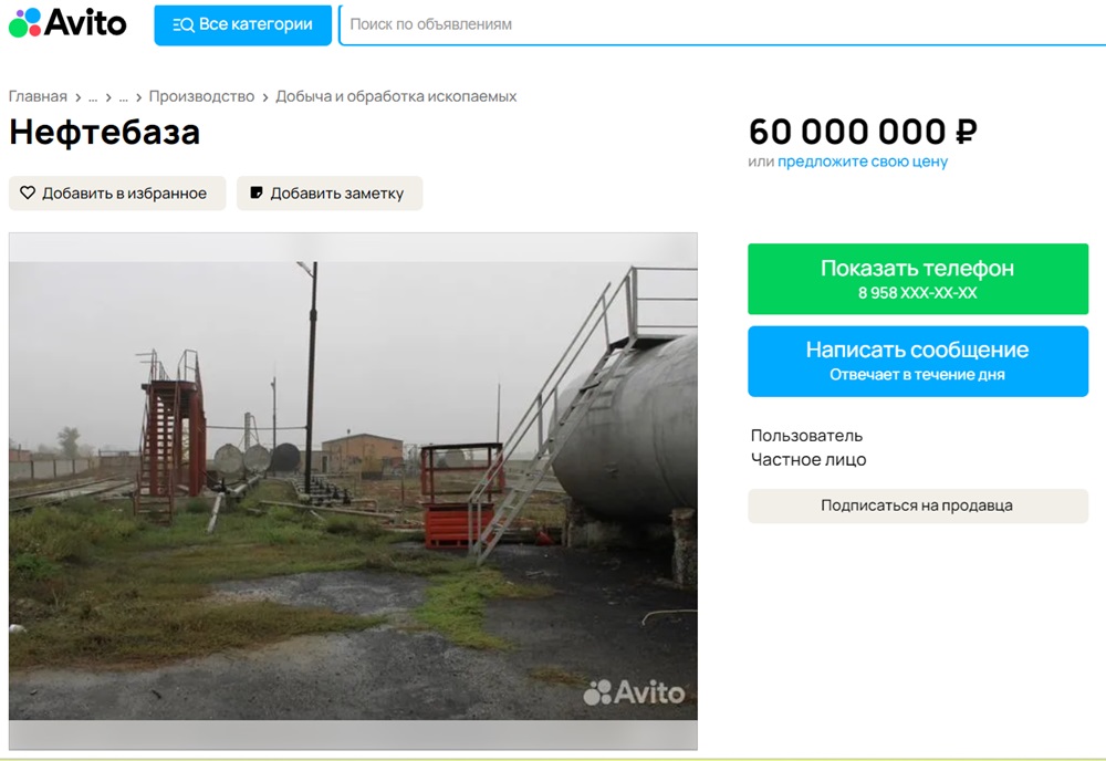 Інше оголошення датовано 19 серпня. «Продається нафтобаза із залізничним шляхом на чотири вагони. Обсяг ємностей під зберігання 1000 куб.м. з перспективою збільшення», — йдеться в оголошенні. Об’єкт знаходиться в Матвієво-Курганському сільському поселенні Ростовської області. Вартість — 45 млн рублів.