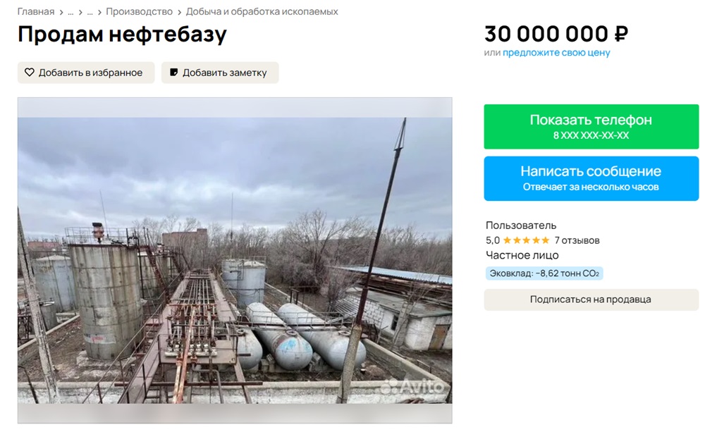 Одне з оголошень на російському Avito про продаж нафтобази розмістили у вівторок, 20 серпня. Власник пропонує купити об'єкт у Волгодонську за 30 млн рублів.