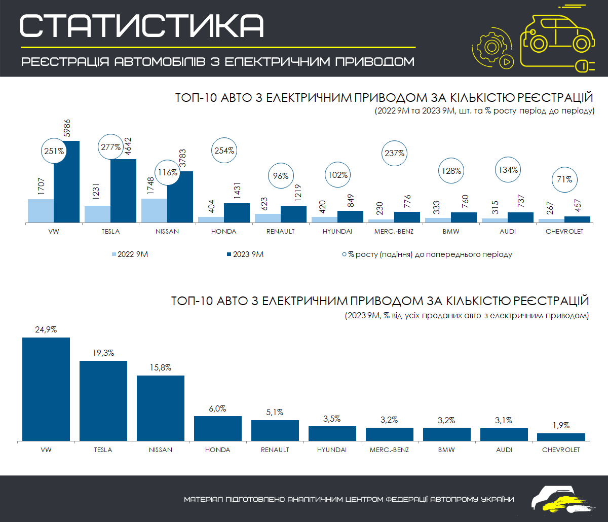 Volkswagen, Tesla та Nissan залишаються лідерами на ринку електромобілів в Україні. Частка бренду Volkswagen становить 24,9% ринку електрокарів. На Tesla припадає 19,3% продажів, на Nissan – 15,8%. Марку Honda обрали 6% покупців електромобілів, а Renault – 5,1%.