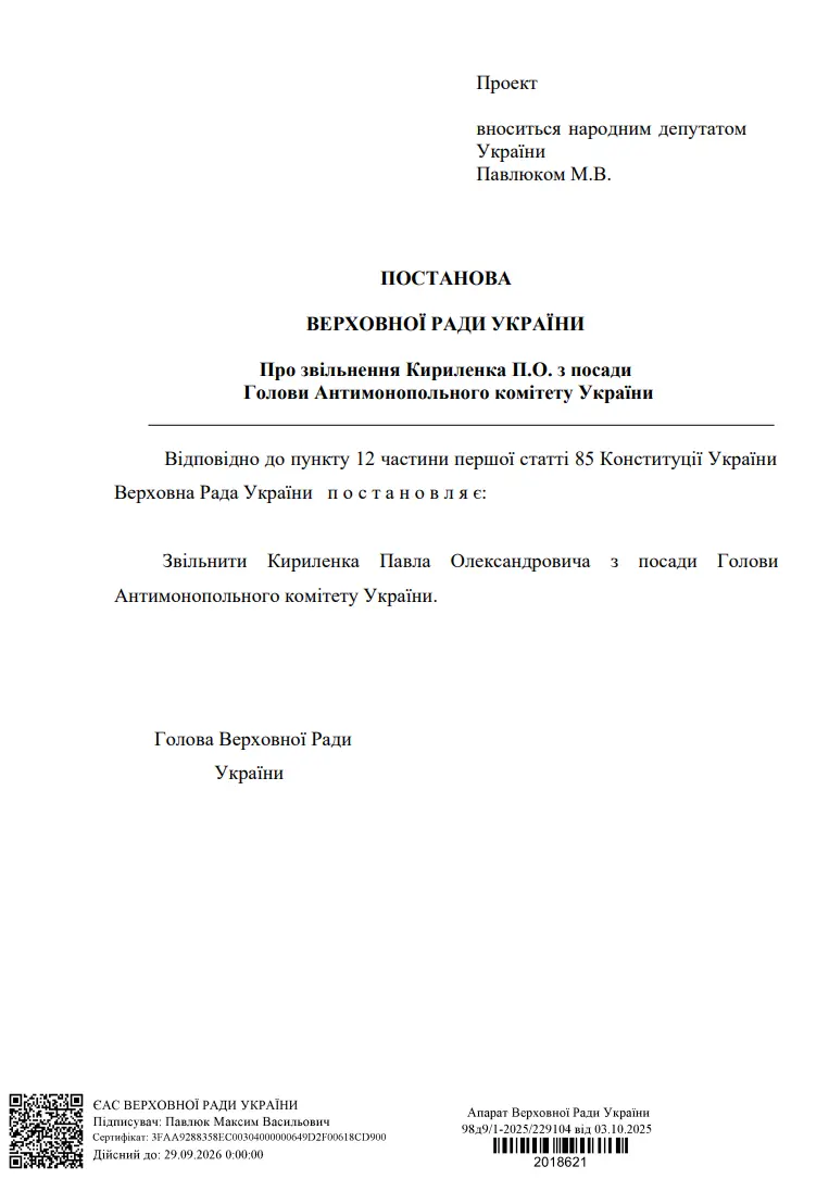 3 жовтня був зареєстрований проект Постанови про звільнення Кириленка Павла Олександровича з посади Голови Антимонопольного комітету України № 14099. Ініціатором є нардеп Павлюк Максим.