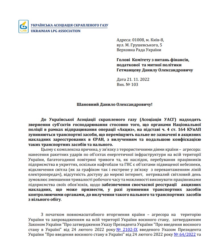 Українська Асоціація скрапленого газу (Асоціація УАСГ) звернулася Голови Комітету з питань фінансів, податкової та митної політики Гетманцева Данила Олександровича з пропозицією на період дії воєнного стану на території України дозволити супроводження транспортних засобів, що переміщують пальне митною територією України акцизною накладною в друкованому вигляді, з обов’язковою її реєстрацією протягом 48 годин з моменту виїзду транспортного засобу з території завантаження.