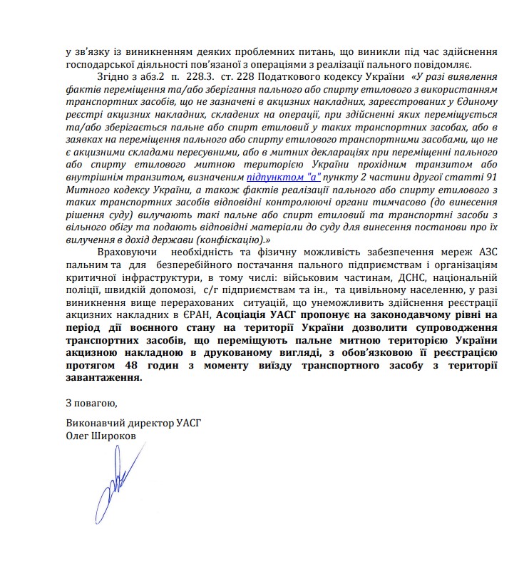 «Враховуючи необхідність та фізичну можливість забезпечення мереж АЗС пальним та для безперебійного постачання пального підприємствам і організаціям критичної інфраструктури, в тому числі: військовим частинам, ДСНС, національній поліції, швидкій допомозі, с/г підприємствам та ін., та цивільному населенню, у разі виникнення вище перерахованих ситуацій, що унеможливить здійснення реєстрації акцизних накладних в ЄРАН, Асоціація УАСГ пропонує на законодавчому рівні на період дії воєнного стану на території України дозволити супроводження транспортних засобів, що переміщують пальне митною територією України акцизною накладною в друкованому вигляді, з обов’язковою її реєстрацією протягом 48 годин з моменту виїзду транспортного засобу з території завантаження.» – підкреслюють в УАСГ.