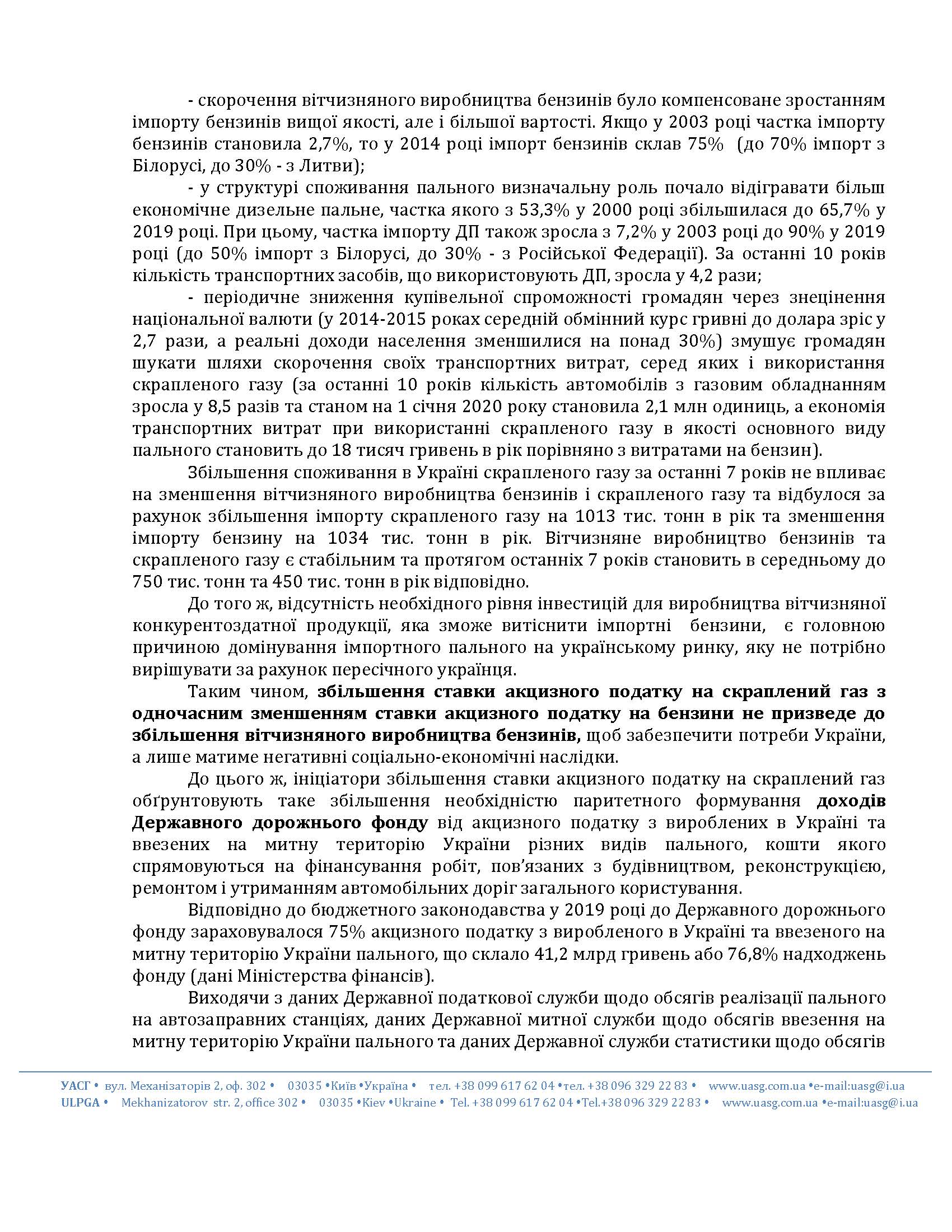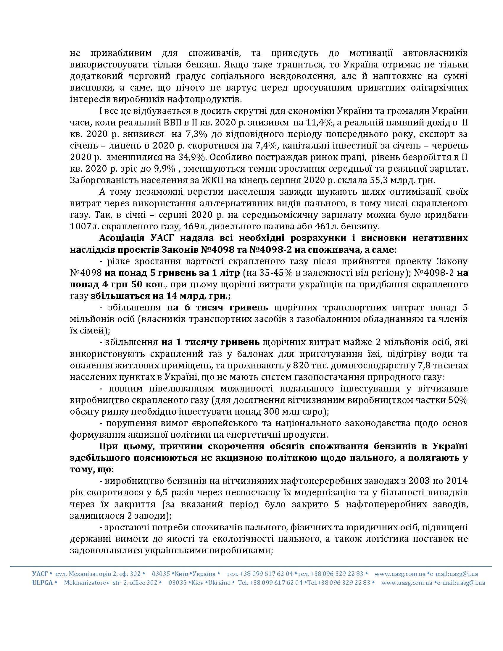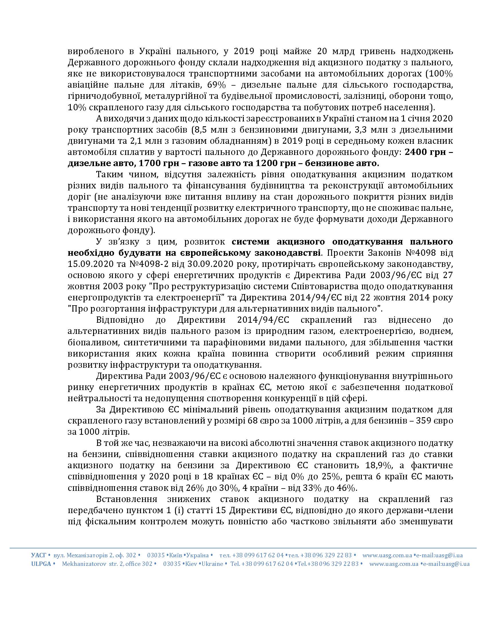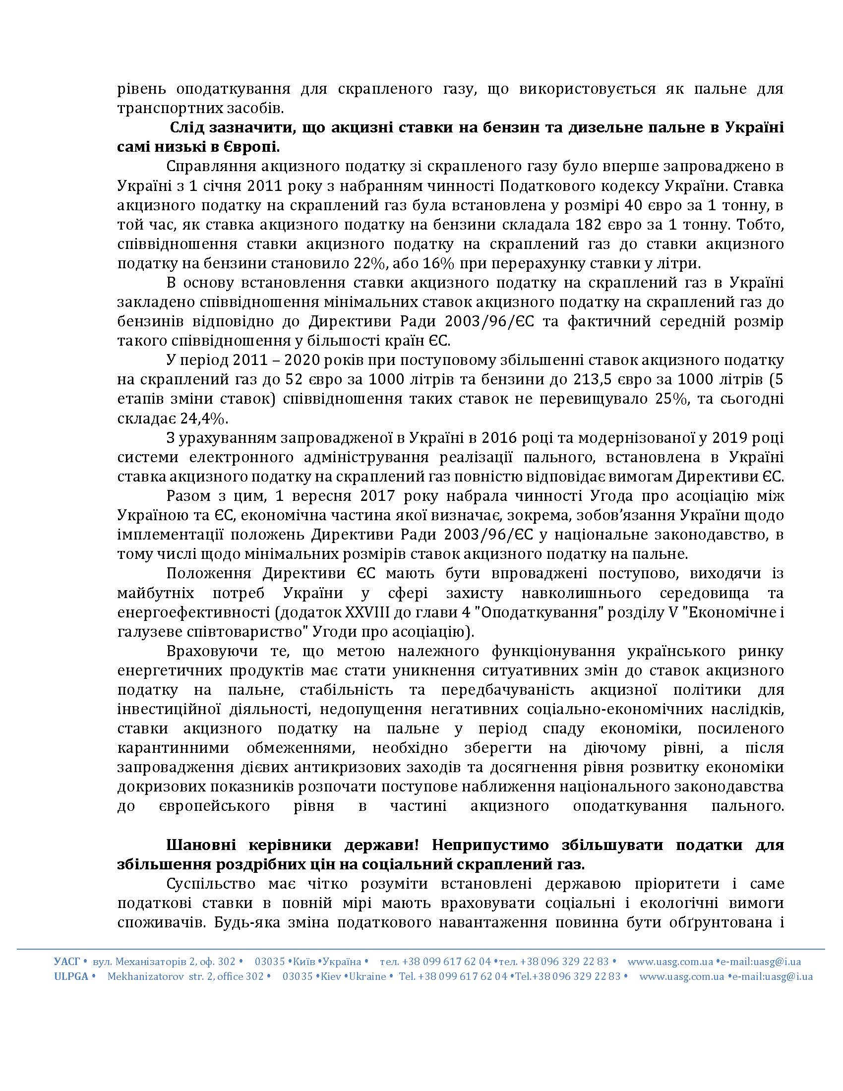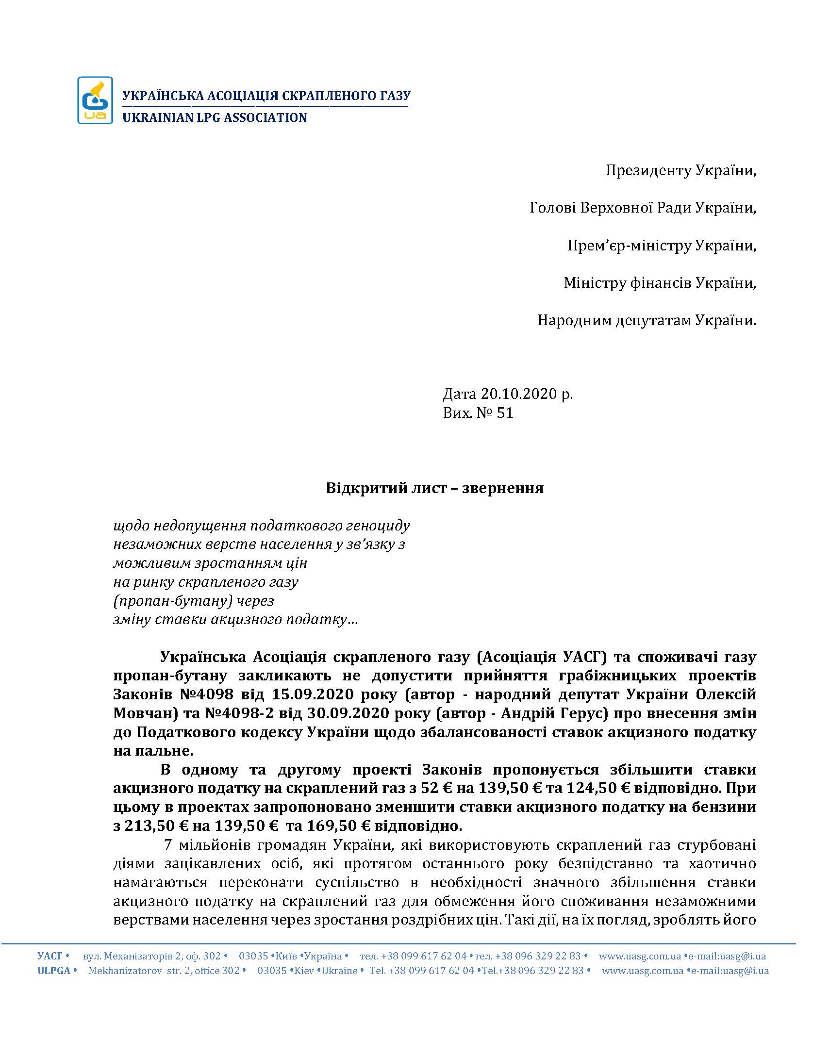 Украинская Ассоциация сжиженного газа (Ассоциация УАСГ) обратилась с открытым письмом-обращением к высшим должностным лицам с просьбой не допустить принятия проектов Законов №4098 от 15.09.2020 года (автор - народный депутат Украины Алексей Мовчан) и №4098-2 от 30.09.2020 года (автор - Андрей Герус) о внесении изменений в Налоговый кодекс Украины относительно сбалансированности ставок акцизного налога на топлива.