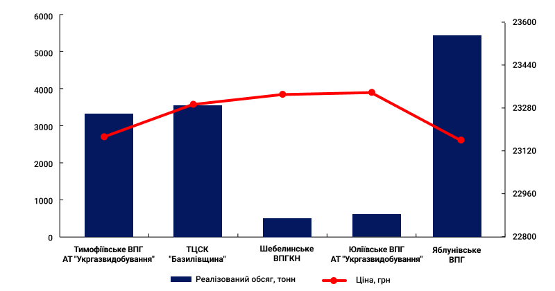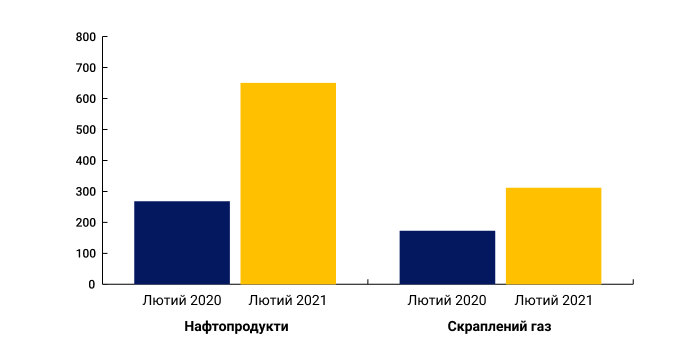 Наибольшие объемы реализации установленные на пунктах: Тимофеевское ВПГ объемом 3325 т на общую сумму 77,1 млн грн; ТЦСК "Базилевщина" - 3553 т в 82,8 млн грн; Яблуновское ВПГ - 5434 т в 125,9 млн грн. Цены реализации сжиженного газа на УЭБ выросли в феврале по сравнению с январем на 27% - до 23 231 грн. с НДС.