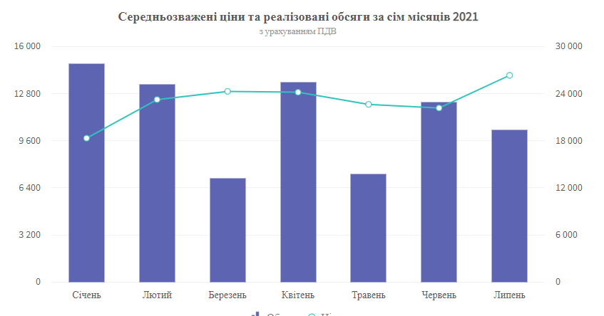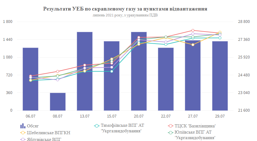 В июле 2021 позиции на продажу сжиженного газа своих структурных подразделений выставляло АО «Укргаздобыча». За анализируемый период на УЭБ было проведено 8 аукционов. Реализовано 10336 т сжиженного газа общей стоимостью 271, 9 млн грн с учетом НДС. Средневзвешенная цена сложилась на уровне 26 313,83 грн/т, что больше цены предыдущего месяца на 18,76%. В общем средневзвешенные цены колебались в диапазоне 24 190,34 - 27 761,92 грн/т. На графике №1 изображено объем реализованной продукции и цены по пунктам отгрузки, а именно Шебелинского ВПГКН, Тимофеевского, Яблунивского, Юлиевского ВПГ АО "Укргаздобыча" и ТЦСК "Базилевщина".