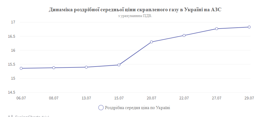 В среднем по Украине розничные цены на АЗС по сжиженному газу за анализируемые даты колебались в диапазоне 15,36 - 16,83 грн/л. (с НДС). Цены с начала июля в розничном сегменте выросли на 10%. На 30 июля самая высокая средняя цена зафиксирована в Луганской области, которая составила 17,25 грн/л. (с НДС), самая низкая была в Николаевской области - 16,70 грн/л (с НДС). Средняя маржа АЗС на одном литре сжиженного газа составляла около 1-1,5 грн.