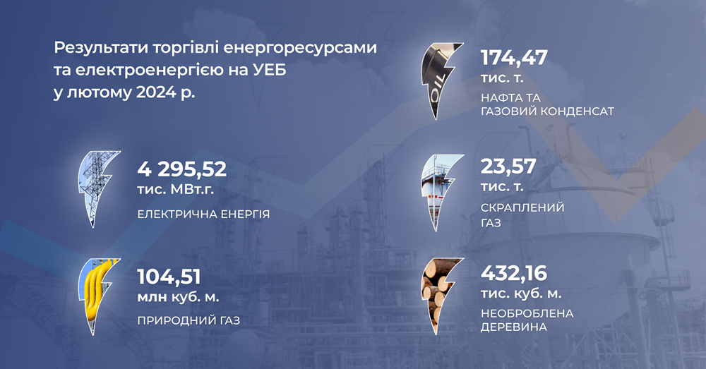 На Українській енергетичній біржі (УЕБ) у лютому 2024 року поміж іншим було продано майже 180 тис. тонн нафти та газового конденсату і майже 25 тис. тонн скрапленого газу. Про це йдеться у повідомленні УЕБ, розміщеному на її сайті.