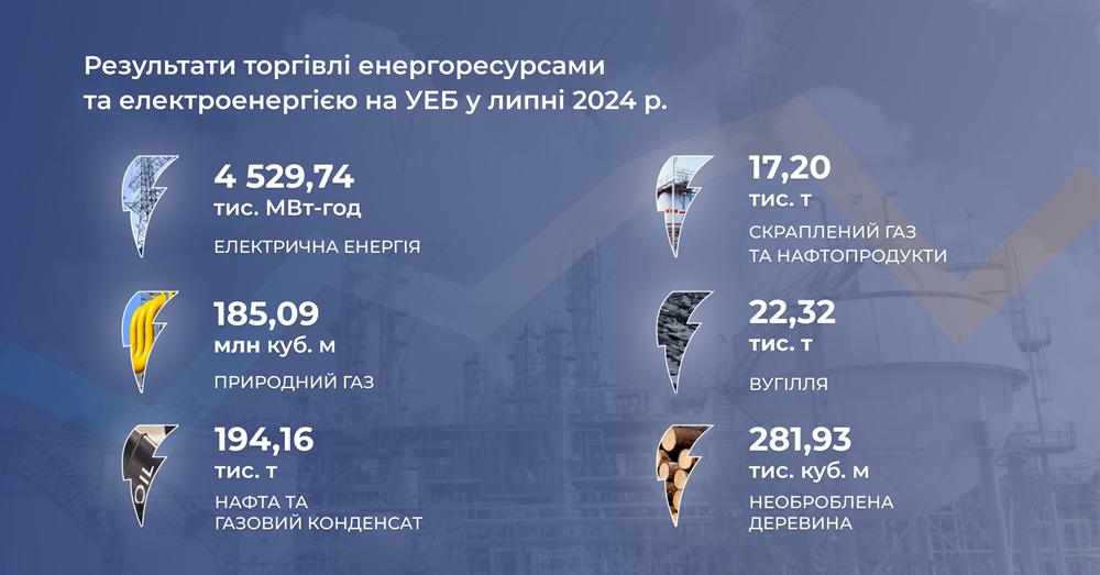 Загалом у липні на УЕБ було проведено 129 торгових сесій у БЕТС, 78 аукціонів з купівлі-продажу електричної енергії в БЕТС у версії «Electric Power», а також по 4 торгові сесії кожного дня були проведені біржею на короткостроковому ринку природного газу.