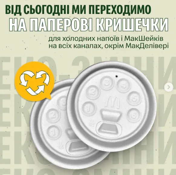 McDonald’s переходить на паперові кришечки для холодних напоїв і МакШейків на всіх каналах продажу, окрім МакДелівері, йдеться у повідомленні.