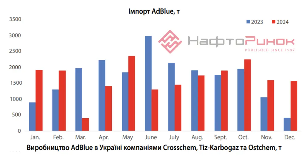 Тим часом імпорт з Литви у 2024 році збільшився на 9% у порівнянні з попереднім роком — до 1,56 тис. т. Постачання з Німеччини зросло на 60 т, до 670 т. З Чехії надійшло близько 200 т AdBlue. Обсяги імпорту з інших країн були неістотними.