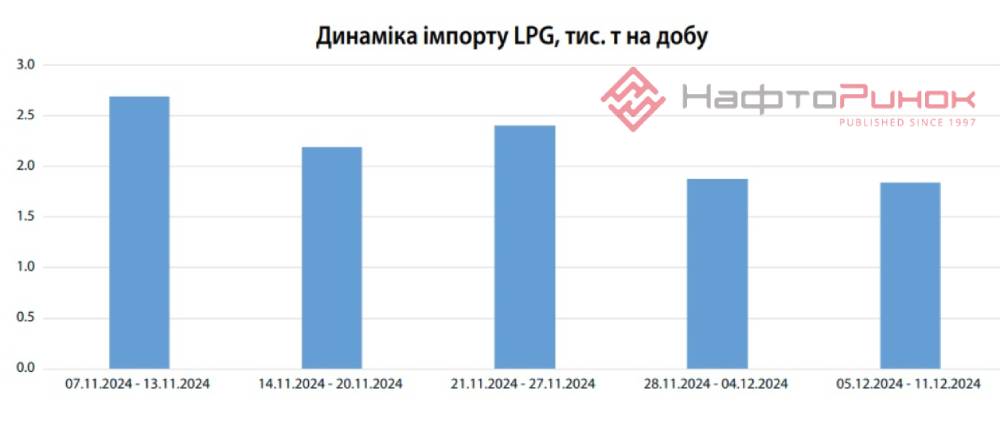 За підсумками 1-11 грудня Україна імпортувала 20,6 тис. т скрапленого газу. Протягом двох останніх тижнів (28 листопада – 11 грудня) середній обсяг постачань становить 1,8-1,9 тис. т на добу, тоді як за період 14-27 листопада — 2,3 тис. т на добу.