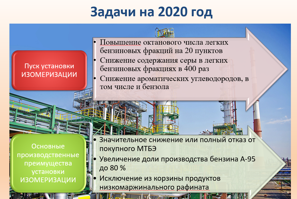 Запуск установки изомеризации и производство изомеризата позволит предприятию выпускать высокооктановые бензины, в том числе под торговой маркой ENERGY, без применения дорогостоящей импортной добавки к топливам - МТБЭ (метил-третбутилового эфира).