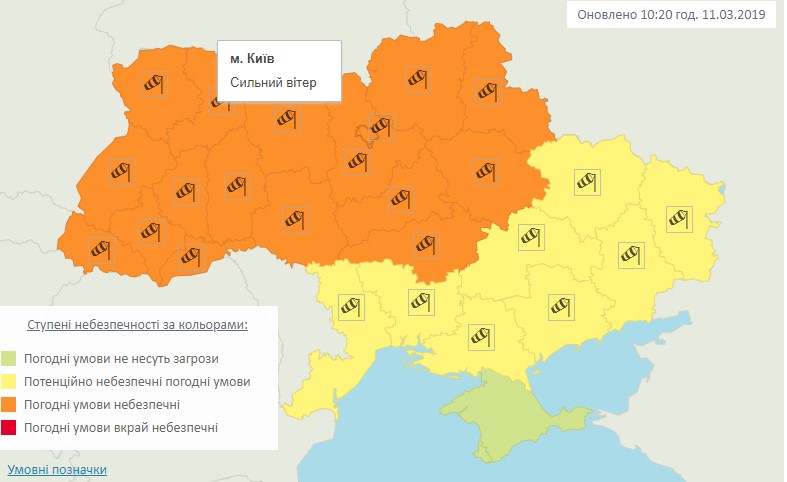 Добавим, Украинский гидрометеорологический центр сообщает, что «до конца суток 11 марта порывы ветра 15-20 м / с, в западных, северных, центральных областях 25-30 м / с (II уровень опасности, оранжевый)»