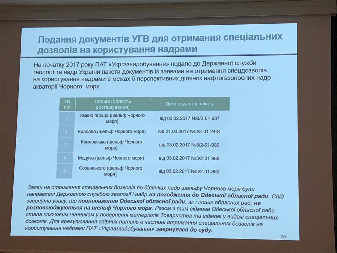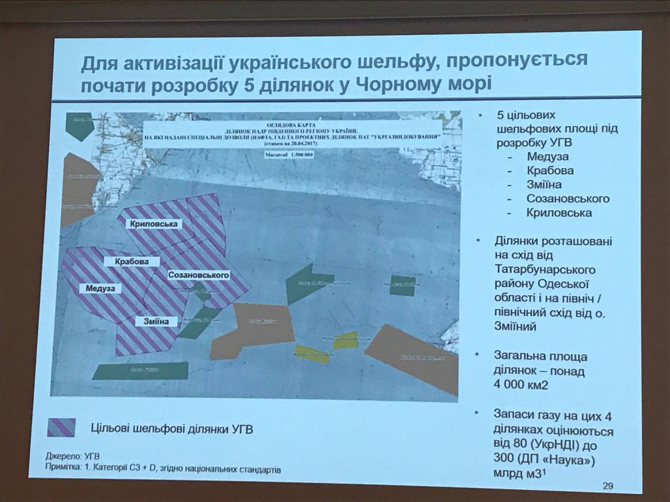 «Мы не просто говорим о потенциале, и перспективах , мы ставим задачи и выходим на результат. Мы хотим заниматься добычей углеводородов на шельфе, поскольку на суше, многие месторождения уже разведаны и находятся или на большой глубине или очень сложны в разработке. Наши соседи, Румыния, инвестировали больше $1 млрд в разработку шельфа. К 2019 году они выйдут на промышленную разработку и затем станут экспортером газа. Они оценивают свои запасы в 100 млрд куб.м газа. Есть и другие успешные примеры: Кипр, Норвегия, Израиль, Египт. Все они разрабатывают шельф. В это же самое время, на нашем участке шельфа, разведанные и доказанные запасы оцениваются в размере от 80 до 300 млрд куб.м газа, и мы его не разрабатываем. Хватит ждать, надо инвестировать и начинать осваивать эти месторождения», - отметил глава правления ПАО «Укргаздобыча» Олег Прохоренко.