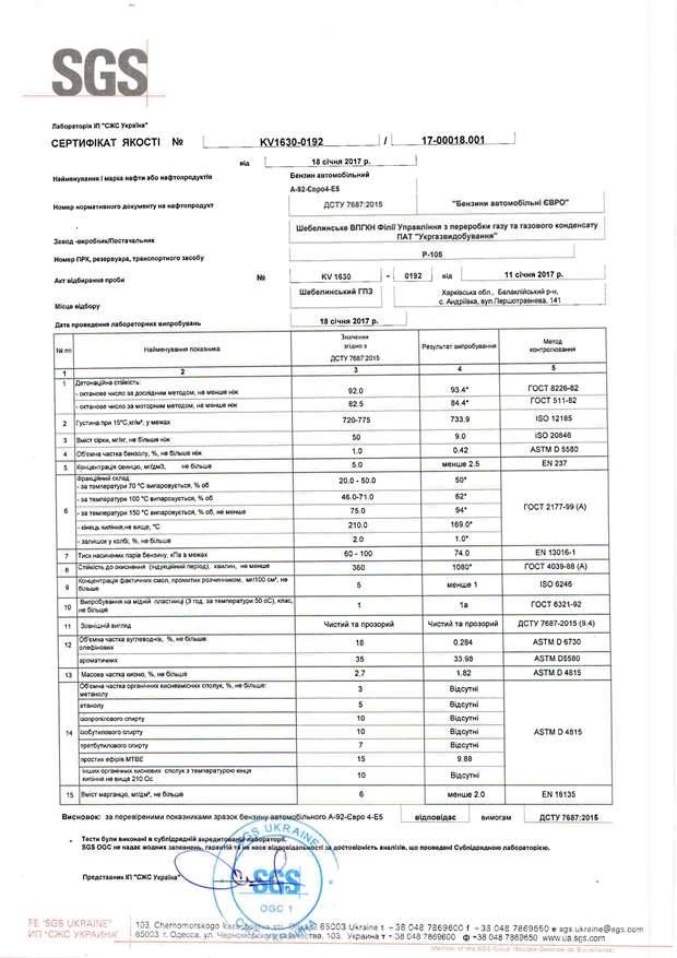 В рамках новой программы в январе этого года компания SGS, которая является мировым лидером по предоставлению услуг инспекций, экспертизы, испытаний и сертификации, провела независимое исследование бензина А-92-Евро-4 производства Шебелинского ГПЗ. Согласно его результатам, топливо полностью соответствует стандарту ДСТУ 7687: 2015. На очереди - исследования А-95 и ДТ.