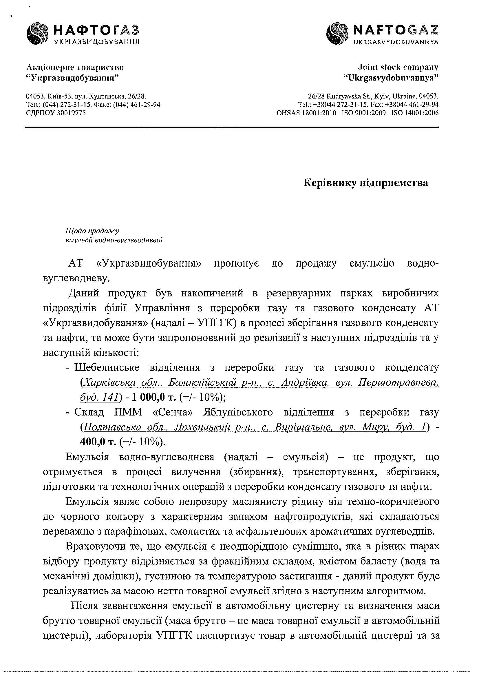 АО «Укргаздобыча» продаст 1400 т водно-углеводородной эмульсии. Об этом сообщили в компании.