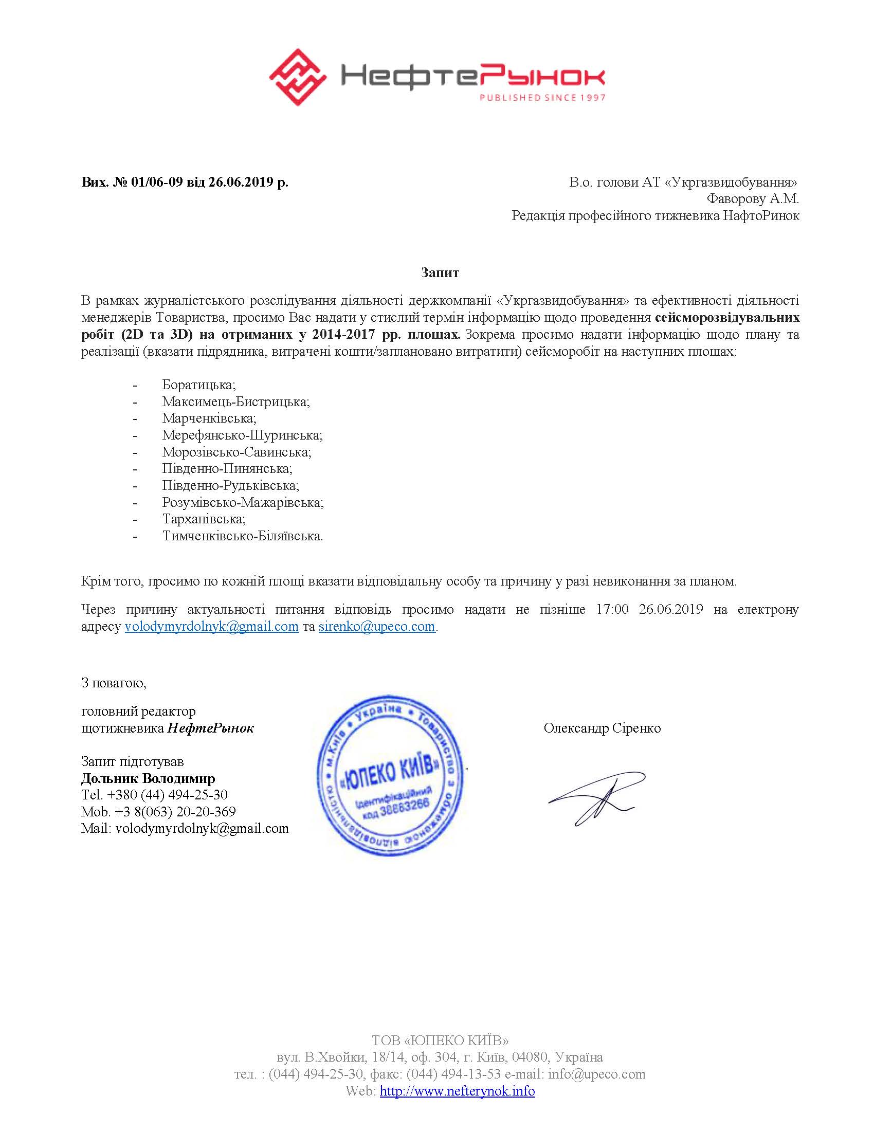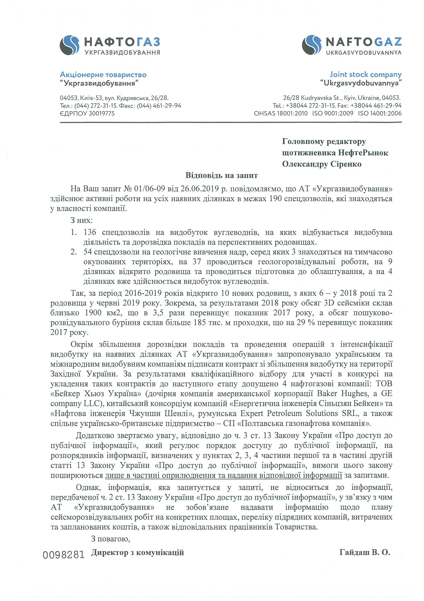 В «Укргаздобыче» отказались отвечать на запрос в части конкретных месторождений, поскольку в компании посчитали, что не обязаны давать информацию о планах сейсморазведочных работ на конкретных площадях, подрядчиках, потраченных средствах, а также ответственных за выполнение работ сотрудников.
