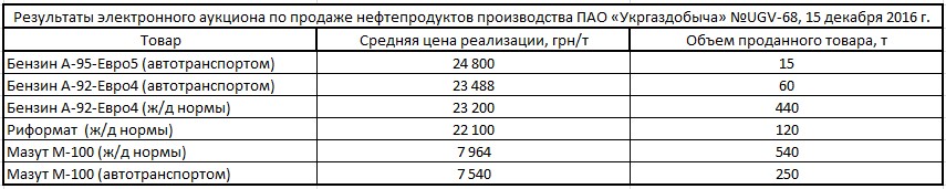 По результатам нефтепродуктового аукциона «Укргаздобычи» 15 декабря, прошедшего в торговой системе УЭБ, компания реализовала 1 425 т нефтепродуктов из 3 260 т выставленных к продаже на общую сумму 20,8 млн грн.