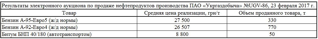 Напомним, по результатам аукциона ПАО «Укргаздобыча» в электронной торговой системе «Украинской Энергетической Биржи» 21 февраля, компания реализовала 715 т из 3 030 т выставленных к продаже нефтепродуктов производства Шебелинского ГПЗ на общую сумму 18,6 млн грн.