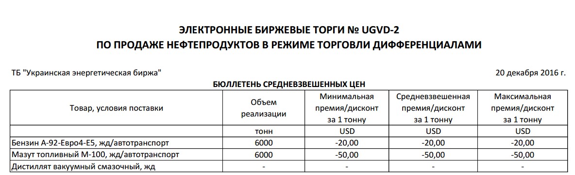 20 декабря 2016 состоялись вторые торги нефтепродуктами украинского производства в режиме дифференциалов. «Укргаздобыча» предложила к продаже в рамках долгосрочных контрактов 60 тыс. т бензина А-92 Евро-4, 36 тыс. т мазута М-100 и 24 тыс. т вакуумного дистиллята смазочного отгрузкой с Шебелинского ГПЗ
