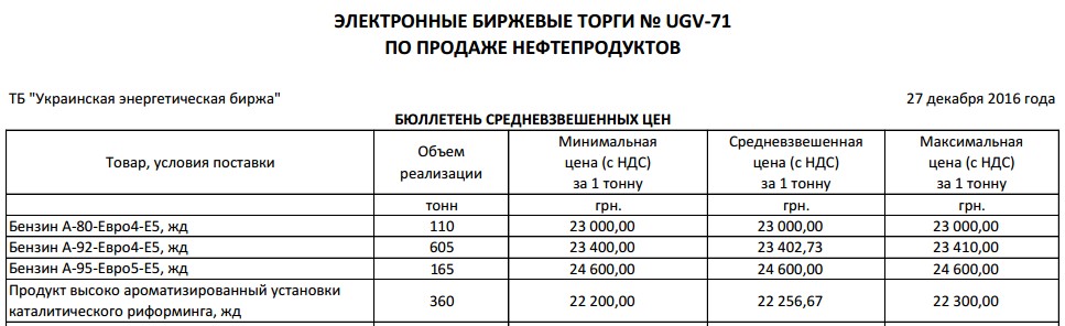В результате аукциона «Укргаздобыча» реализовала 110 т бензина А-80 Евро-4 ж/д партиями по средней цене 23 000 грн/т, 605 т бензина А-92 Евро-4 по 23 402 грн/т, 165 т бензина А-95 Евро-5 по 24 600 грн/т.