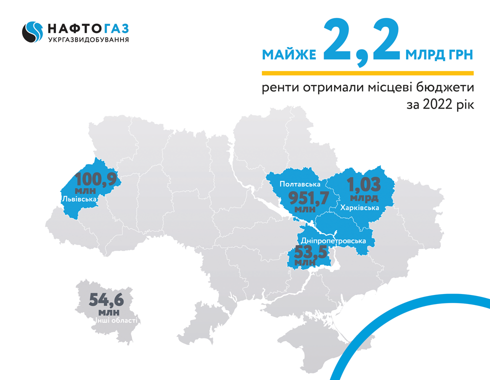 АТ «Укргазвидобування» у 2022р сплатило 43,8 млрд грн рентних платежів, як повідомляє пресслужба компанії. Згідно законодавства, місцеві бюджети отримують 5% від рентних платежів, повыдомляє ExPro. УГВ сплатило до місцевих бюджетів 2,2 млрд грн.