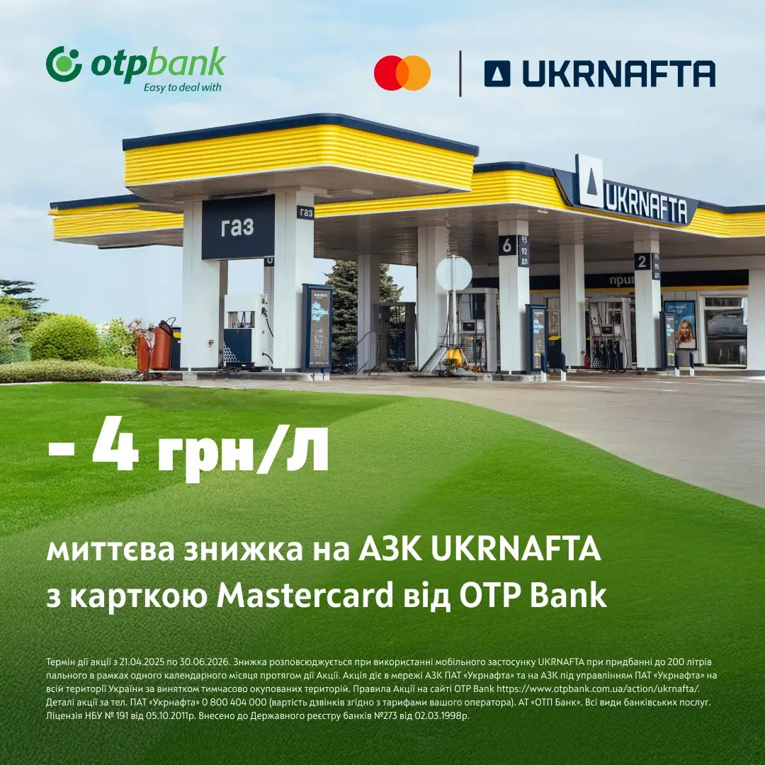 Компанії та мережа продовжили до 30 червня 2026 року спеціальні знижки на пальне на АЗС Ukrnafta за умови оплати бензину картками Mastercard від OTP Bank.